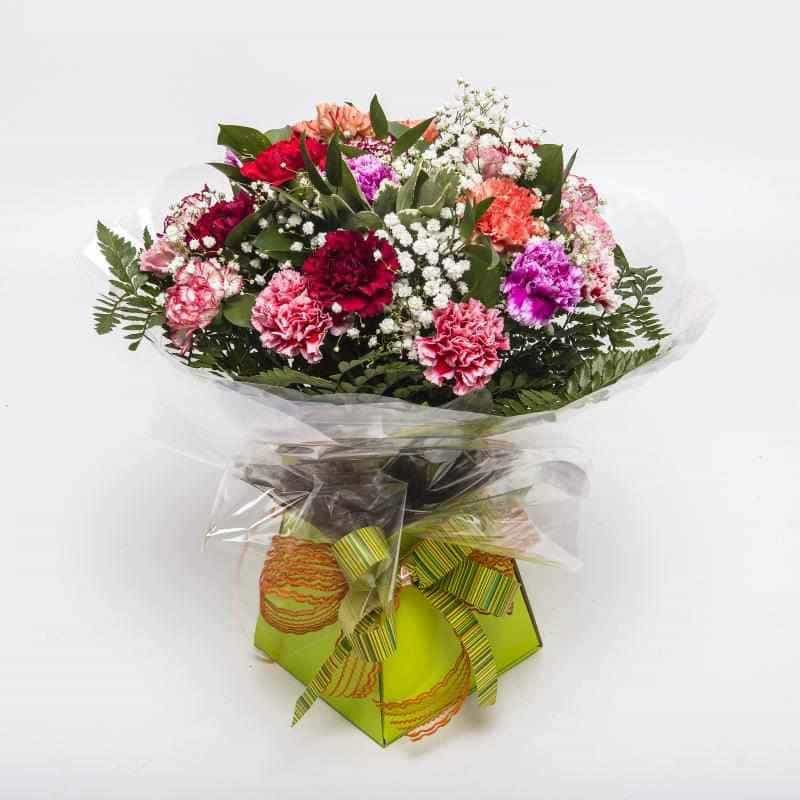 A simple tasteful Bouquet of long lasting large headed mixed coloured carnations blended with gypsophila and tropical foliage. Makes a delightful display and will last for at least two weeks - we guarantee it!
