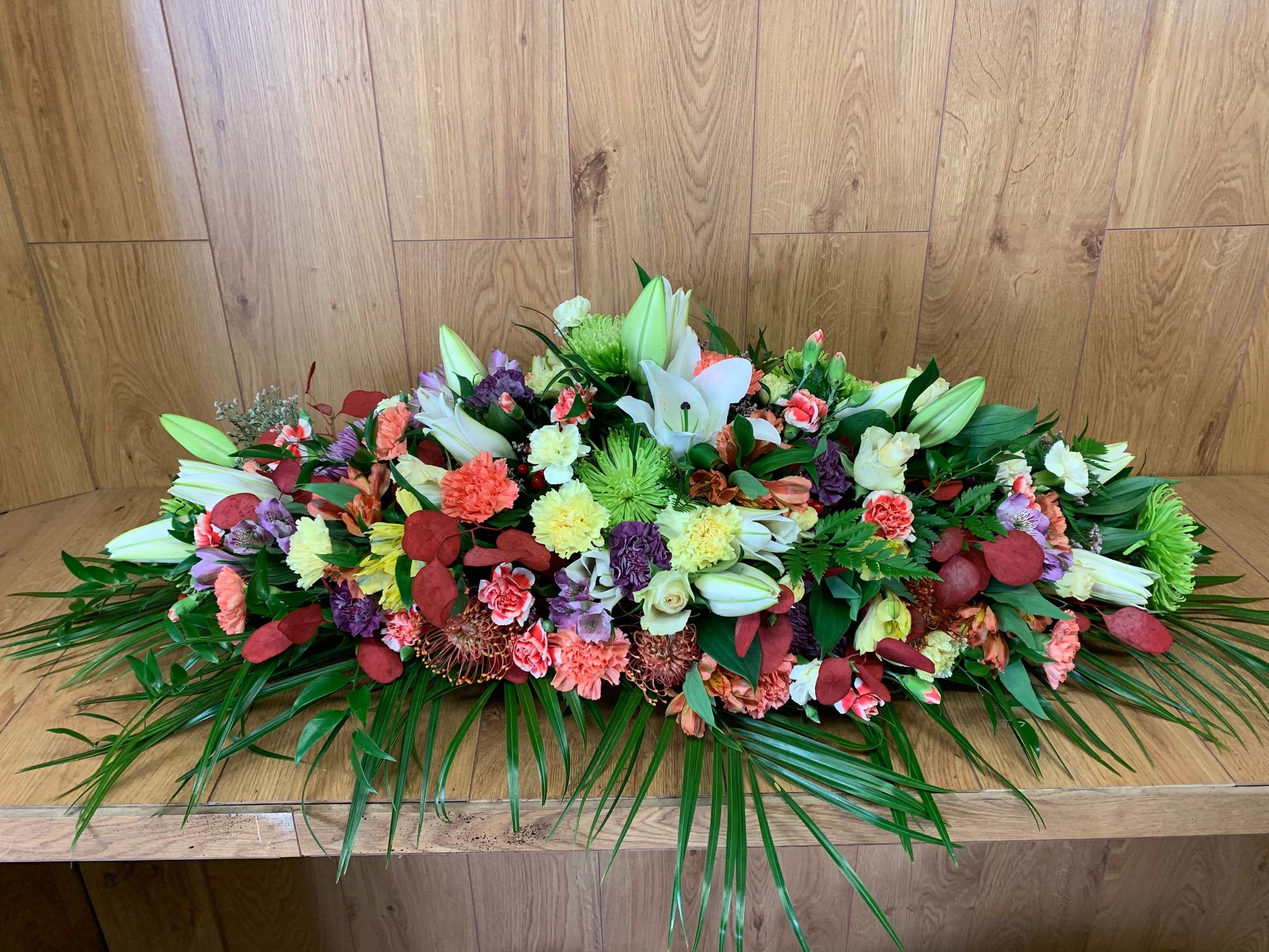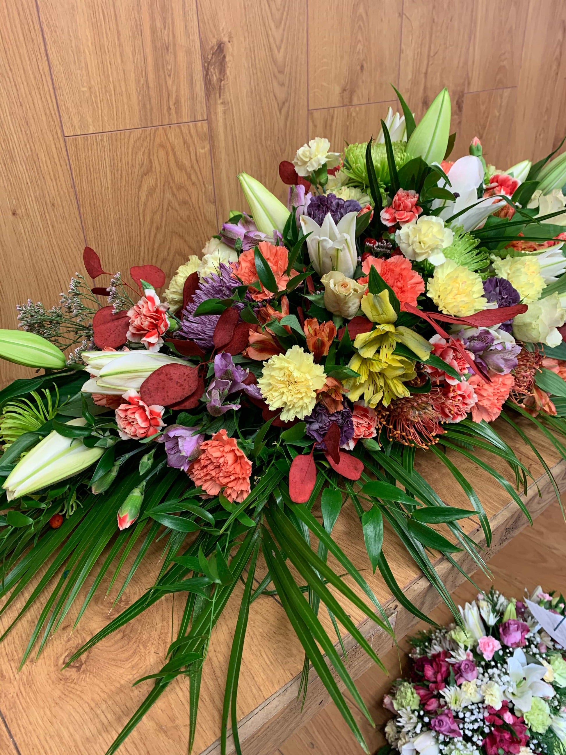 A mixture of your choice of flowers expertly arranged will personalise this emotional centrepiece, Contact us directly to discuss your exact requirements. Ranges of colours and flower types can be suited to each individual customer.