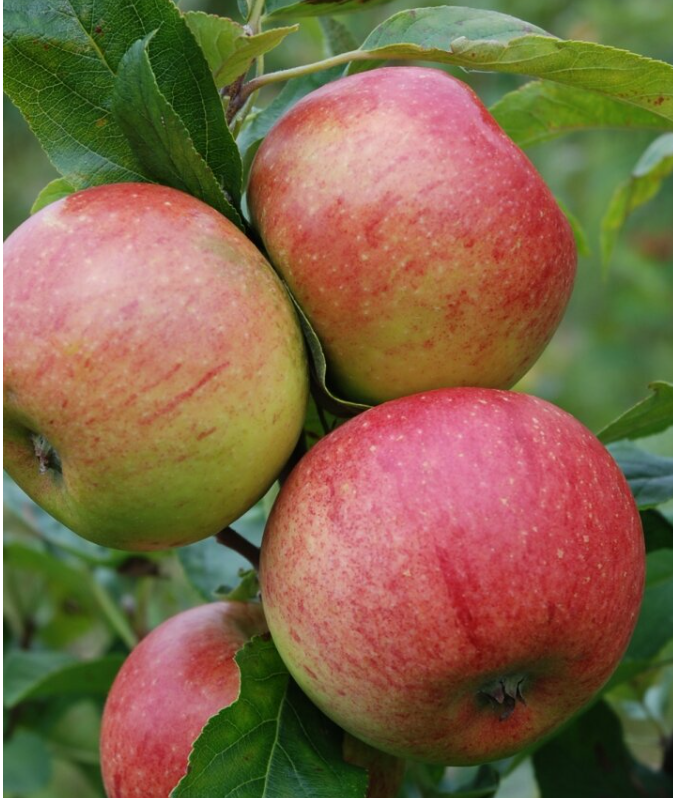 A dual purpose cultivar in pollination group 3. It is partly self-fertile but crops better with a pollination partner. The flowers are pure white, and the large, conical fruit are sweet, juicy, firm and lightly aromatic. The skin colour is greenish-yellow flushed and striped with red, with some russetting. Season of use September to December